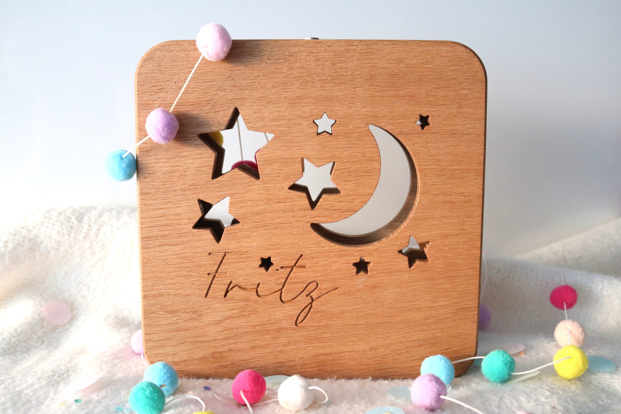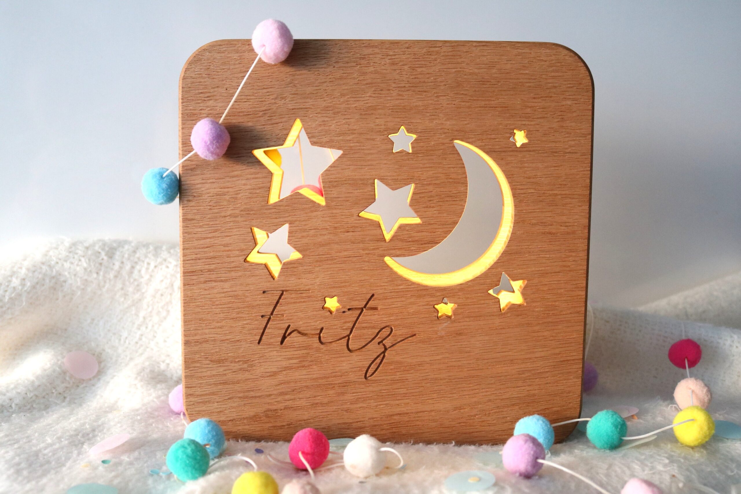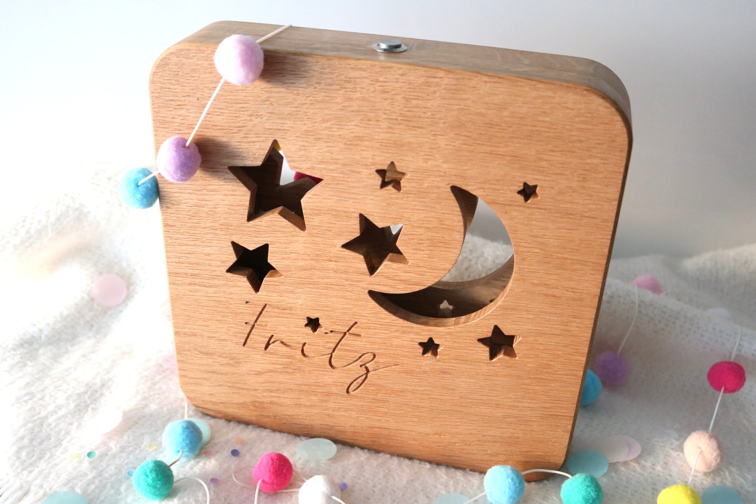 Liebevoll gestaltetes Nachtlicht aus Eiche Echtholz für Babys und Kinder.