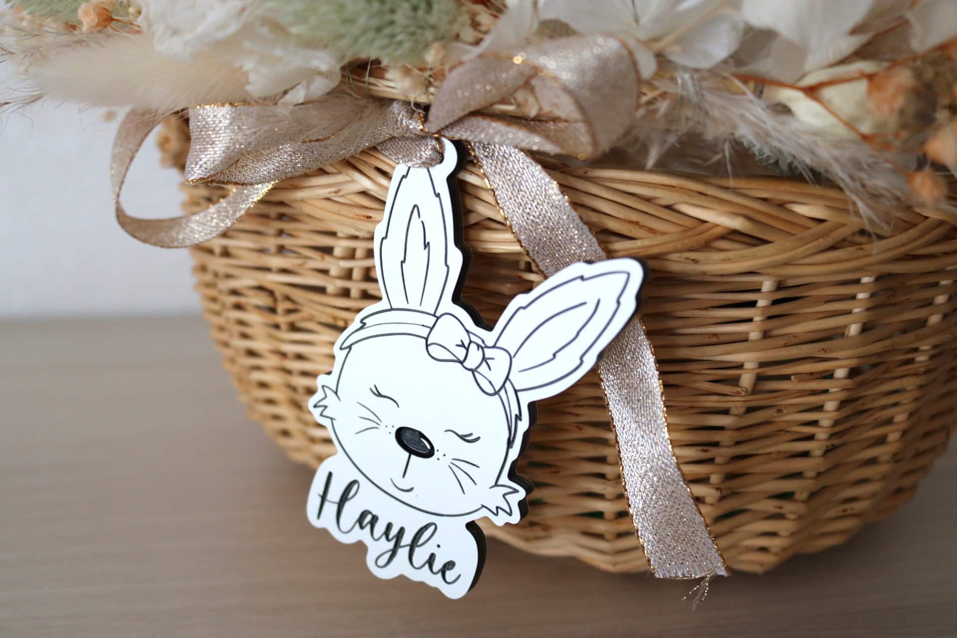 Personalisierter Osteranhänger für ein kleines Hasenmädchen, die ihr Osterkörbchen sucht.